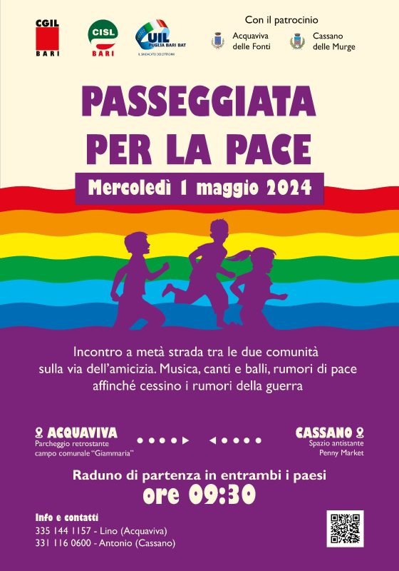 In occasione del 1° maggio, festa dei lavoratori, le organizzazioni territoriali di CGIL – CISL e UIL di Cassano delle Murge e di Acquaviva delle Fonti, intendono riproporre l’oramai consueto appuntamento con la passeggiata della pace, che purtroppo resta d’attualità nel mondo.