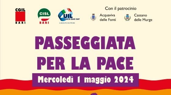 In occasione del 1° maggio, festa dei lavoratori, le organizzazioni territoriali di CGIL – CISL e UIL di Cassano delle Murge e di Acquaviva delle Fonti, intendono riproporre l’oramai consueto appuntamento con la passeggiata della pace, che purtroppo resta d’attualità nel mondo.