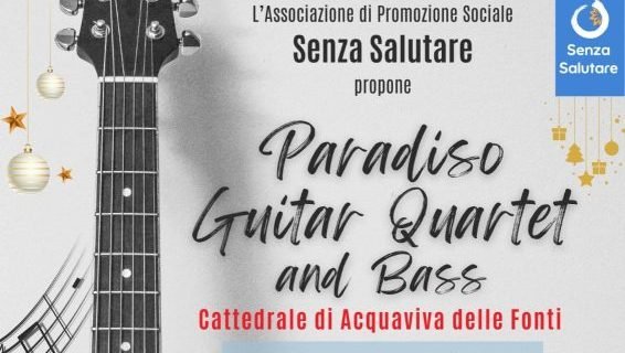 L’Associazione di Promozione Sociale Senza Salutare propone questa sera alle ore 20:00 nella splendida cornice della Cattedrale di Acquaviva delle Fonti “Paradiso “Guitar Quartet and Bass” con musiche di Vito Nicola Paradiso, Morricone e classici del repertorio natalizio novecentesco.