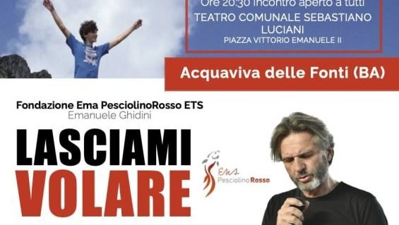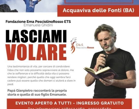 L’associazione di Promozione Sociale “Senza Salutare” propone l’incontro-testimonianza “Lasciami volare” a cura della Fondazione Ema PesciolinoRosso ETS, giovedì 10 Aprile alle ore 20:30 presso il Teatro Luciani di Acquaviva delle Fonti. Il valore della vita e delle relazioni raccontato attraverso la storia di un padre e di un figlio.