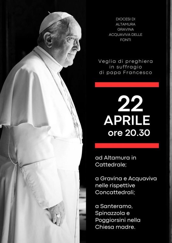 L’intera comunità diocesana, guidata dal suo Pastore, Mons. Giuseppe RUSSO, si unisce in comunione per il successore di Pietro, affidandolo alla misericordia del Padre, con una veglia di preghiera in programma questa sera, alle ore 20.30.