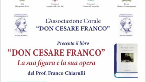 Di questo grande musicista e sacerdote di Acquaviva delle fonti non si è mai parlato molto o comunque abbastanza ma una ricostruzione biografica documentata ed illuminante è stata curata dal Prof. Franco Chiarulli con il suo ultimo libro: “DON CESARE FRANCO” La sua figura e la sua opera, e sarà presentato martedì 30 settembre, alle ore 19.00, nella cattedrale di Acquaviva delle Fonti.