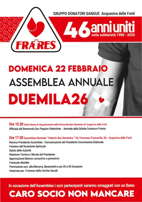 Si terrà oggi, domenica 22 febbraio 2026 alle ore 17:30 presso l’Oratorio di “San Domenico” in Via Francavilla, la consueta Assemblea annuale dell’Associazione Donatori di Sangue “FRATRES” di Acquaviva delle Fonti.
